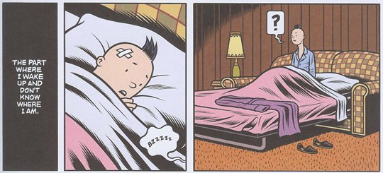 Il nome che il personaggio assume in questo mondo sotterraneo — Nitnit, ovvero Tintin al contrario — è un ulteriore omaggio alla creatura del fumettista franco-belga Hergé. E se nelle sue avventure Tintin era accompagnato dal cagnolino bianco di nome Milù, questo suo omologo underground non poteva non avere per fido compagno un gatto nero, Inky. Vien da sé che i due mondi sono paralleli sotto molti aspetti, a cominciare dal fatto che sia Doug sia Nitnit hanno la testa fasciata per ragioni che verranno presumibilmente svelate in una delle prossime puntate (stando a quanto annunciato dallo stesso Burns ne sono previste altre due). Altrettanto evidente parrebbe che il travaso da un dimensione all’altra avvenga per via onirica. Tanto Doug che Nitnit iniziano le rispettive peripezie a letto, pronunciando la seguente fatidica frase: “Ecco l’unica parte parte che mi ricorderò. La parte in cui mi sveglio e non so dove mi trovo”. Una sensazione simile assale il lettore dopo una ventina pagine, quando l’intreccio tra la sfera dei sogni e quella della realtà si fa così ingarbugliato da dubitare che il sogno sia soltanto un sogno e la realtà effettivamente reale. Forse una bussola nel labirinto è rappresentata dalla figura del padre, che compare, immutato, in entrambi i mondi. Ma confidare in un orientamento certo sarebbe comunque insensato. Nel mondo di Burns spesso le domande vengono sollevate per restare senza risposta giacché è governato dalle stesse impenetrabili regole vigenti nei film di David Lynch. E per dirla tutta, non si avverte affatto la mancanza di spiegazioni razionali. Ci basta abbandonarci all’atmosfera di adolescenziale straniamento ed emarginazione che pervade ogni suo graphic novel e che in questa sua ultima abbacinante fatica trova un momento significativo quando Doug legge i suoi cut-up. Cosa c’è infatti di più comicamente crudele di una performance alla William Burroughs fischiata da un pubblico di rockettari alternativi? Forse Lady Gaga che dice, come di recente ha fatto: “A volte mi sento ancora come la sfigata del liceo”. Ma questa è un’altra storia. O meglio: un altro incubo.
